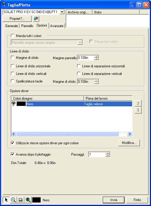 La scheda Opzioni consente di impostare diverse opzioni specifiche per il taglio dei lavori.
